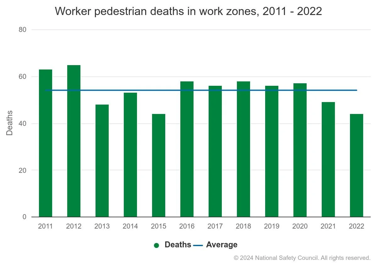 An average of 54–105 workers per year are struck and killed while on foot in active work zones